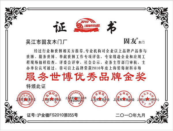 服務(wù)世博優(yōu)秀品牌金獎